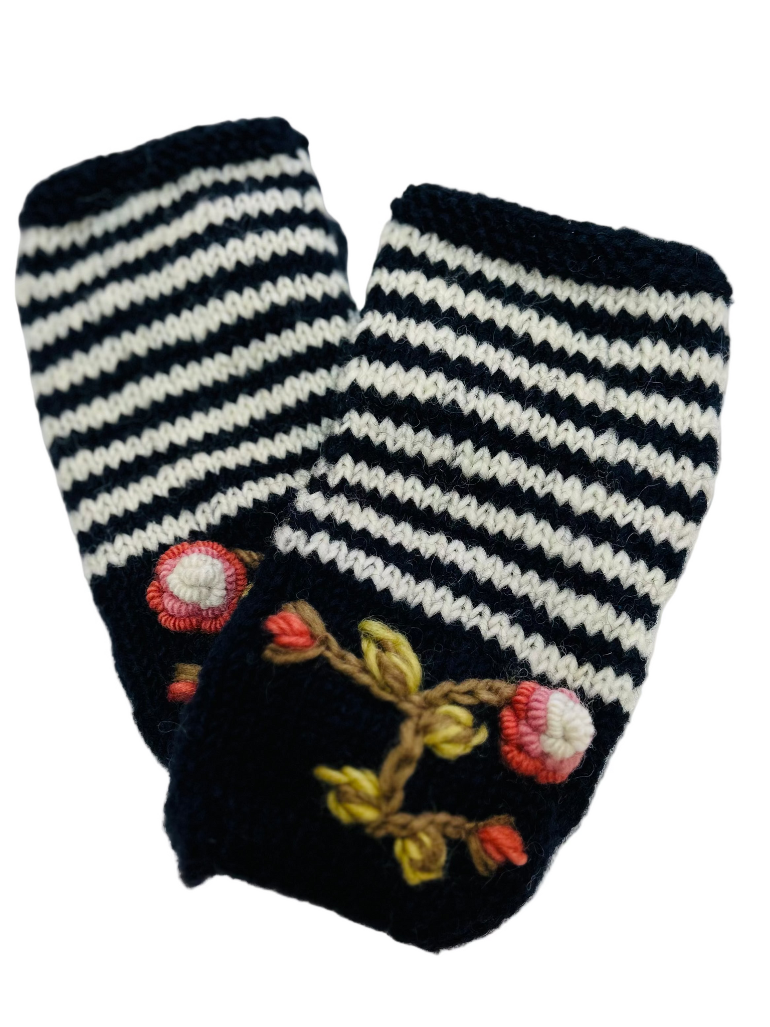 Hand knit navy blue wool with beautifully hand embroidered Fuchsia rose detail