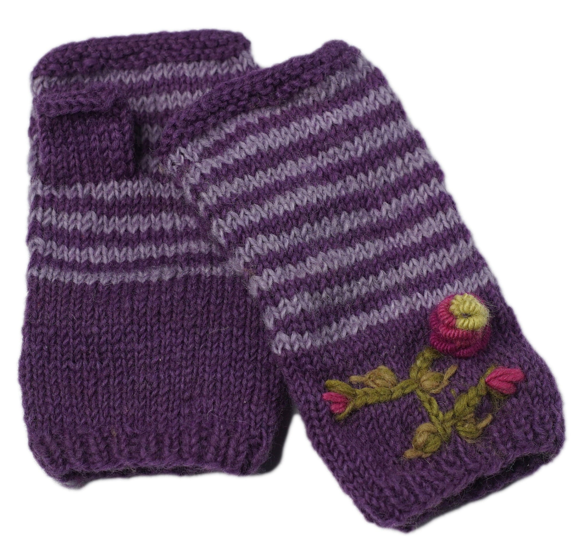 Hand knit Purple wool with beautifully hand embroidered Fuchsia rose detail