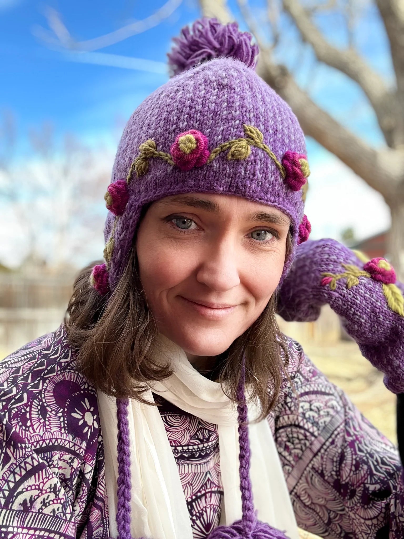 Hand knit black wool with beautifully embroidered pink and gold rose detail