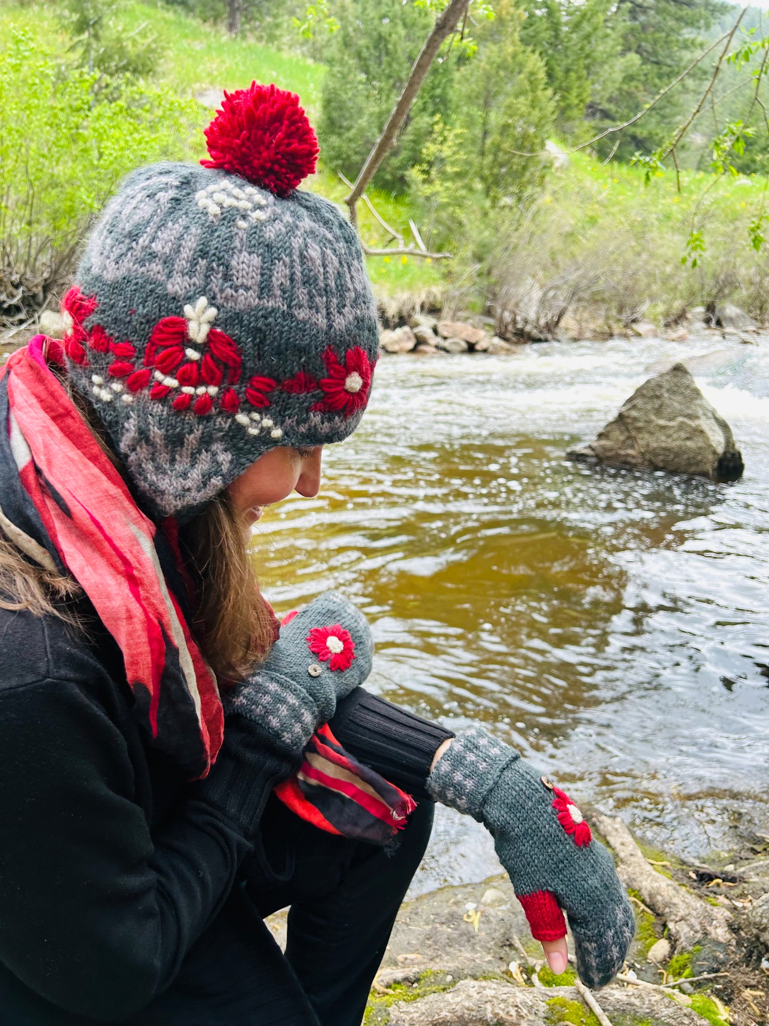 This is the Zoe Convertible Mitten The classic color of this hat will make it a timeless piece of your winter wardrobe. Two shades of grey come together to make the knit design as a beautiful background for the hand worked red floral embroidery on the back of the hand. White French Knots are that final detail that lightens and brightens your look.