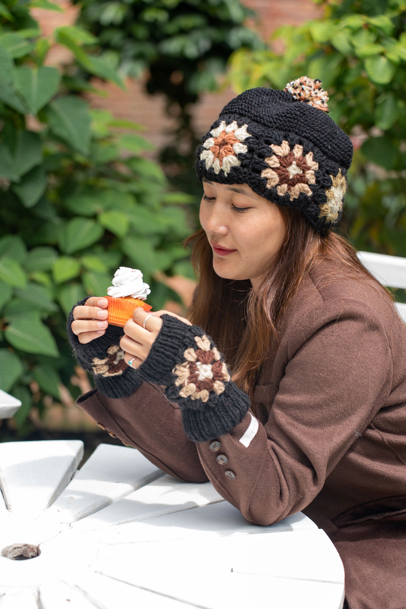 Our Emma Hat is back in New Brown colorway - a hand crocheted in wool with vibrant floral design at brim and multicolored pompom.