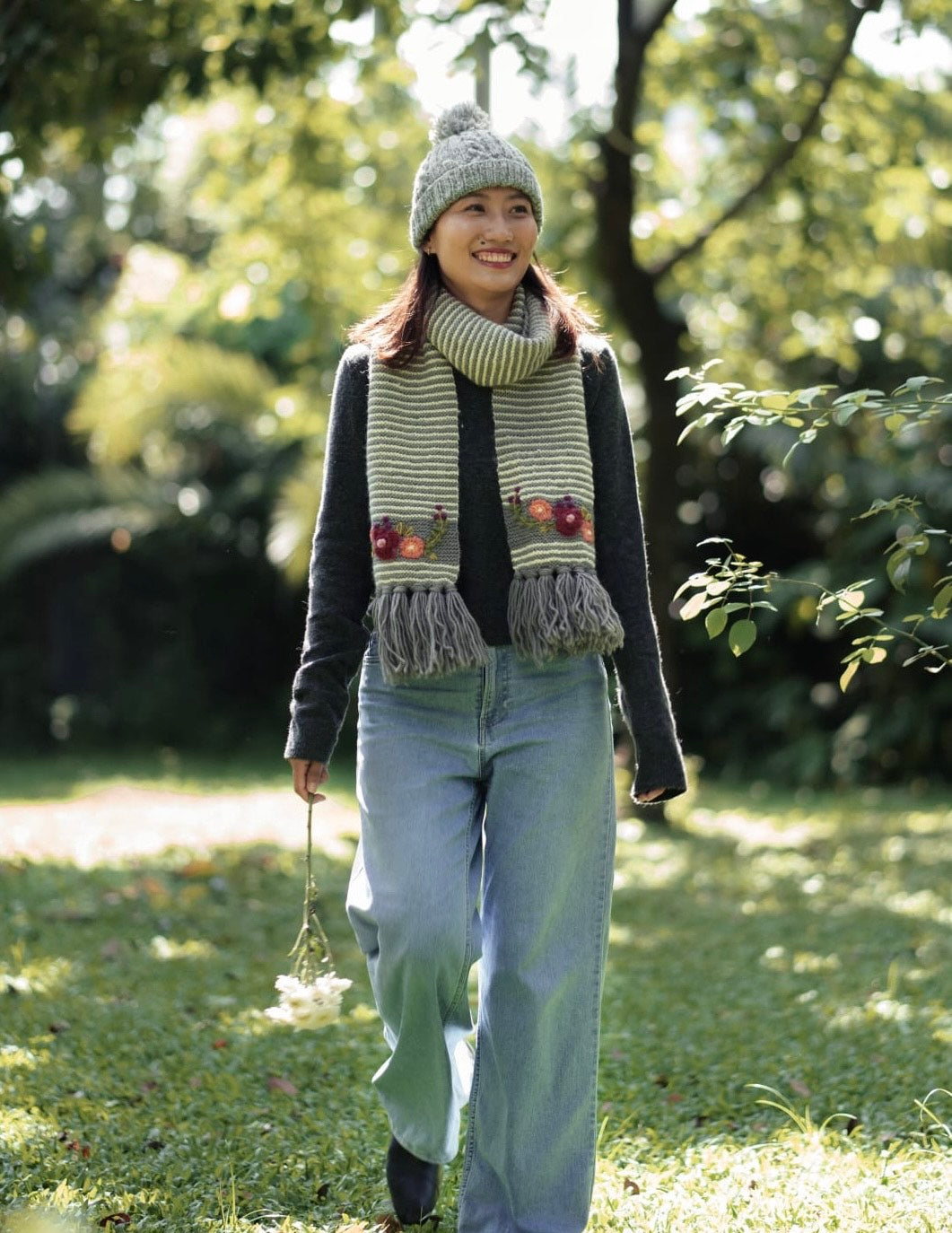 Ultra Soft and natural gillbox wool fibers are knitted in garter stitch stripes to make this delightful scarf. The Grey and white striped background is the perfect complement to a colorful and beautifully hand embroidered floral flourish in shades of orange pink and red with green bullion knot fern tendrils and finished with thick luxurious fringe.