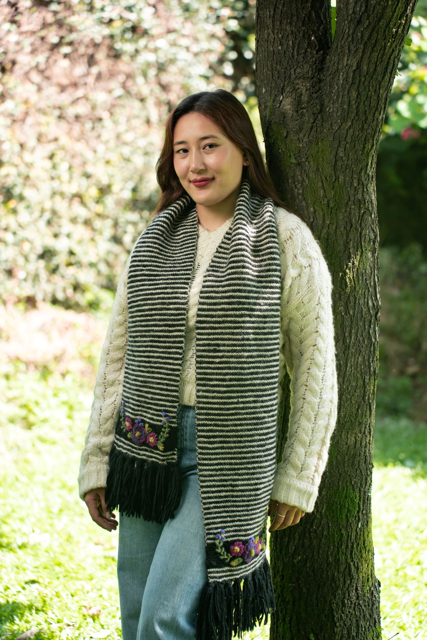 Ultra Soft and natural gillbox wool fibers are knitted in garter stitch stripes to make this delightful scarf.  The Black and white striped background is the perfect complement to a colorful and beautifully hand embroidered floral flourish in shades of violet and pink with green bullion knot fern tendrils and finished with thick luxurious fringe.